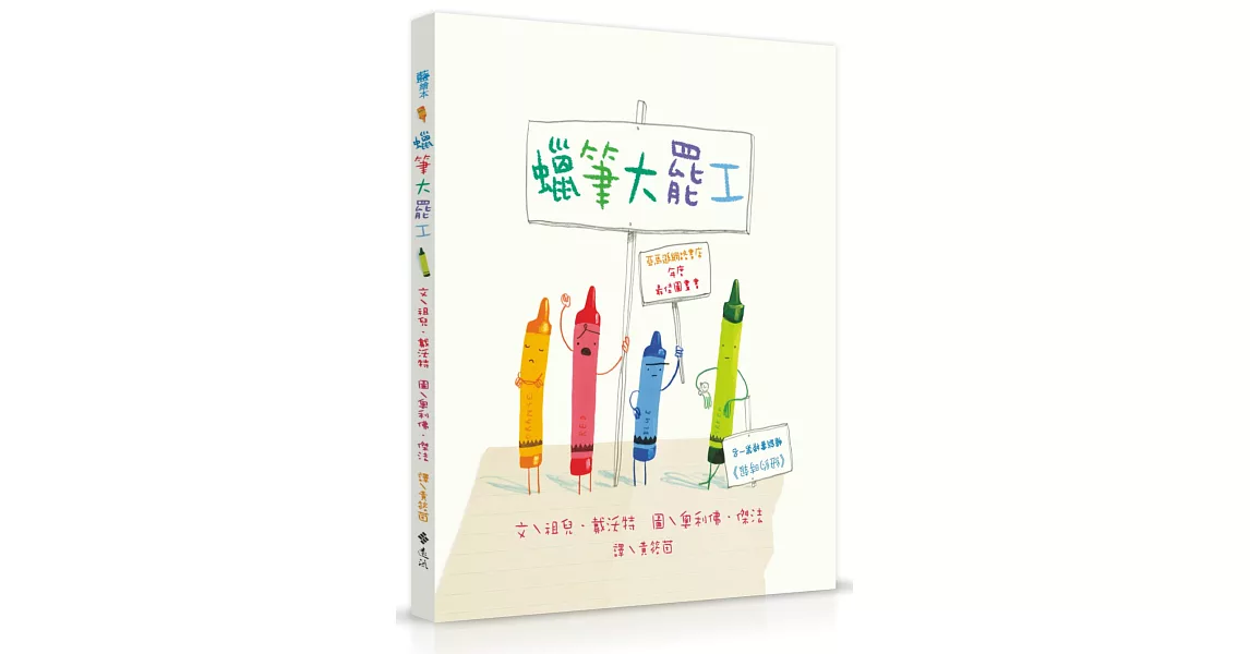 詳細資料ISBN:9789573274148 叢書系列:藍繪本 規格:精裝 / 40頁 / 12K / 25 X 25 CM / 普通級 / 全彩印刷 / 初版 出版地:台灣 內容簡介紐約時報暢銷繪本作家奧利佛‧傑法最新插畫作品 ※亞馬遜網路書店2013年度最佳童書 ※GOODREADS閱讀網2013年度最佳圖畫書 ※BARNES & NOBLE 2013年度最佳圖書 ※獲《書單》《出版人週刊》《華爾街日報》《柯克斯書評》等好評推薦 ※美國《紐約時報》暢銷書排行榜第一名 鼓勵孩子跳出框架思考,發揮創意,自由想像! 聽聽罷工蠟筆的心聲,學習溝通與體貼他人的感受! 啥咪?蠟筆也有「情緒」! 小肯有天想畫畫時,打開蠟筆盒卻只看見一疊蠟筆寫給他的信。平常待在蠟筆盒裡,看起來非常友善的蠟筆們到底說了什麼呢? 紅色蠟筆覺得自己的工作時數太長了,因為有一堆東西都是紅色的:消防車、蘋果、草莓……,就連假日他都需要上班(看看聖誕節大街小巷喜悅的紅色,還有情人節隨處可見的愛心!)紫色蠟筆非常受不了小肯老把自己那麼漂亮的顏色塗到框框外〈猜猜紫色蠟筆是什麼星座?〉;灰色蠟筆覺得他負責著色的動物體型都太龐大了〈大象、河馬和犀牛對著他笑,他卻一副愁眉苦臉的模樣!〉;黑色蠟筆抱怨自己總是在畫輪廓,很想獨當一面〈他希望小肯偶爾至少也畫一顆黑色的海灘球嘛!〉;綠色蠟筆對自己的工作量很滿意,沒什麼怨言,不過他在幫他的兩個朋友寫信──黃色蠟筆和橙色蠟筆因為老是在爭論誰才是「正宗的」太陽的顏色,已經不跟彼此講話了!粉紅色蠟筆抗議小肯身為男生老是不用他著色;蜜桃色蠟筆則煩惱自己的包裝被撕掉,全身光溜溜,根本連蠟筆盒都沒辦法離開〈小朋友的確很愛撕掉蠟筆的包裝呀,可憐的蠟筆們,嗚嗚〉…… 於是,儘管理由各有不同,幾乎每封信都在抱怨一件事,就是蠟筆們受夠了,他們要罷工。 可憐的小肯該怎麼做,才能平息蠟筆們的不滿,畫出一幅很棒的畫呢? 初試啼聲的作者祖兒.戴沃特與著名的圖畫書作家奧利佛.傑法攜手合作,在這個生動又富有想像力的故事裡,為這一場由蠟筆帶來的危機創造了一個色彩繽紛的解答。孩子們將一面大笑,一面用一種全新的方式,跟他們的蠟筆們一同遊戲!名人推薦 新竹教育大學幼教系助理教授 周婉湘 專文導讀 圖畫書創作家 曹俊彥、藝術工作者 宋珮、作家/音樂工作者 劉軒、導演 郭亮吟、親子作家 張美蘭(小熊媽)、文學工作者 黃筱茵 滿意推薦【國際媒體讚譽】 初試啼聲就令人矚目,戴沃特用逗趣的書寫說服了讀者,而傑法的蠟筆畫則繪出了這些圓柱體蠟筆的感受:每幅跨頁的左邊都模擬了一張攤開的信紙,以蠟筆各自的色調呈現;旁邊一頁則舉證了小肯怎樣使用這種顏色的蠟筆,例如在一張畫著巨大的大象、犀牛和河馬的圖畫裡,灰色蠟筆感嘆著:「我一個人負責著色的面積,未免太大片了吧。」這些蠟筆鮮明的特質會讓讀者們用理解的眼光瞥向他們自己的蠟筆盒。──《出版人週刊》星級推薦 傑法創造出活力十足又趣味洋溢的插畫。他的繪畫隨興又生動,用少少幾筆就讓筆下的角色表現出情感。聰明的跨頁──比如小肯的「雪中的白貓」──完美的捕捉了蠟筆遇到的難題,而結合實物攝影的呈現方式又為本書提供了另一種層次的質地,使整個故事具有可信度,對蠟筆和色彩展現了有趣又新鮮的眼光。──《《柯克斯書評》 鮮活有趣。奧利佛.傑法靈活又充滿喜悅的插畫,傳達出蠟筆們感受當中的力量與喜劇。4到8歲的孩子看到自己的色彩偏好被如此畫下來,會因為認同而開懷大笑。──《華爾街日報》 【名家分享】 蠟筆的自由宣言 文/曹俊彥(圖畫書創作家) 這是想要當總統的人應該要看的一本圖畫書,可以從其中瞭解罷工的人為何罷工? 雖然這些蠟筆想要罷工或想要休息的原因都不大一樣,但是可以看出它們共同的願望,就是希望它們的小主人小肯能夠瞭解它們。能夠從圖畫中獲得更多的快樂。 想想看,如果香蕉一定是黃的,蘋果一定是紅的,大象一定是灰的,天空一定是藍的。那麼畫畫一定是一件極枯燥、無聊的工作!蠟筆們很怕,這樣的工作會「磨」掉它們寶貴的生命,它們希望解除那些一成不變,無趣而煩躁的限制。讓生命磨得更加精采。 罷工還沒有正式展開,蠟筆們先透過書信表達它們的委屈、煩惱、不平和希望,這些書信幫助大約小學中年級的小肯思考一些大大小小的問題,包括蠟筆為什麼一定要穿衣服,畫圖一定要先畫輪廓線嗎? 蠟筆們的書信帶來小肯勇敢的改變,就像德國表現主義畫家馬克(FRANZ MARC)於二十世紀初畫了藍色的馬一樣。這樣的改變不但解放了色彩的自由,也開闊了創作的空間,畫圖的樂趣更多了,圖畫的創作欲自然也提高了。 這些蠟筆的抗議書信,不只表達了蠟筆們的心聲,也讓讀者學會如何運用語言、文字表達自己想法。對於不公平的待遇,如何清楚說明,並提出自己的主張。養成民主法治社會,理性的生活態度與能力。 而這本書最精采的是作者用童話國度的想像力讓本來就五彩繽紛的蠟筆,表現出各自的個性,在蠟筆盒裡營造了文學的劇場空間。 宋珮(藝術工作者) 這本書雖以擬人化的蠟筆,和他們的抱怨為主要內容,卻經由文字與圖畫,幽默的勾勒出一個隱身在其後的小男孩身影,讓小讀者彷彿也看到自己平日如何隨意、率性的塗鴉。而蠟筆們的抱怨夾雜著提醒,幫助愛畫圖的小讀者想一想:用色是否可以更自由一點、更多一